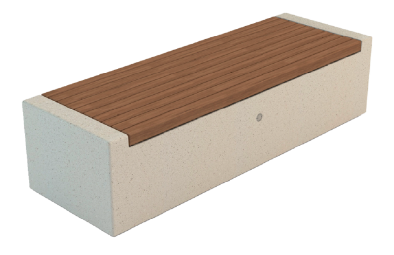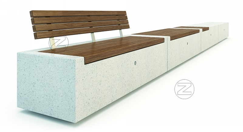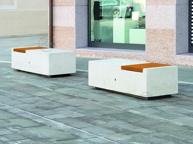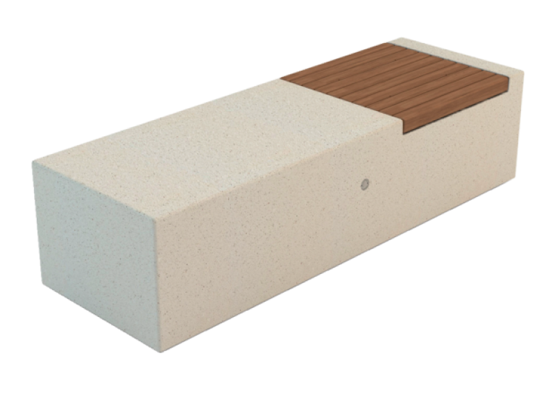 Klop iz betona - bel granit, s sedalno površino in naslonom v tropskem lesu.