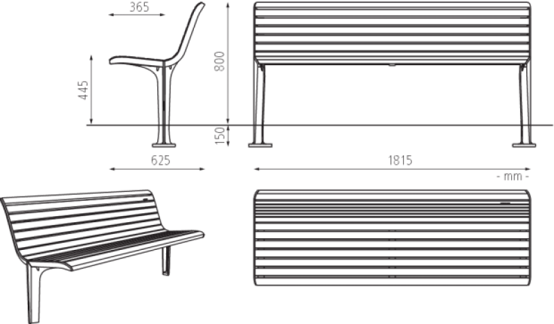 Sedalna površina, hrbtni naslon in rokonasloni iz lesenih letev.