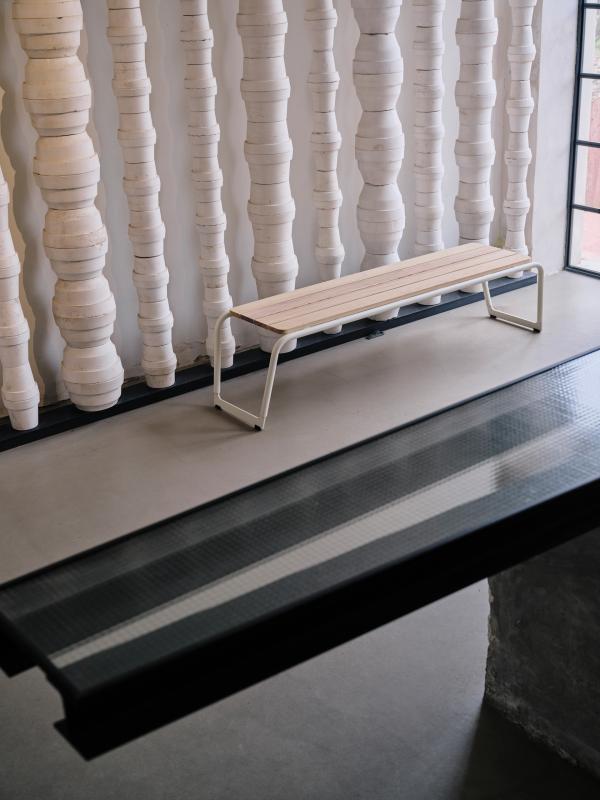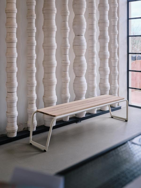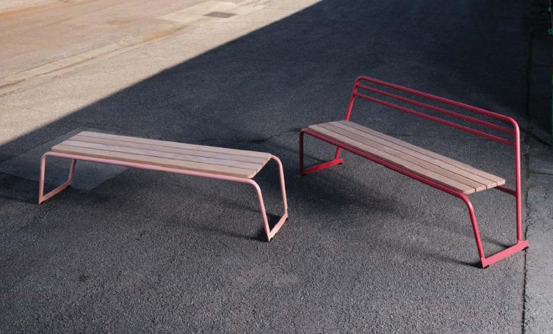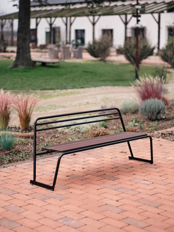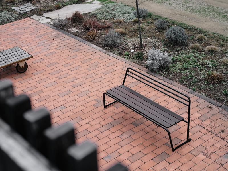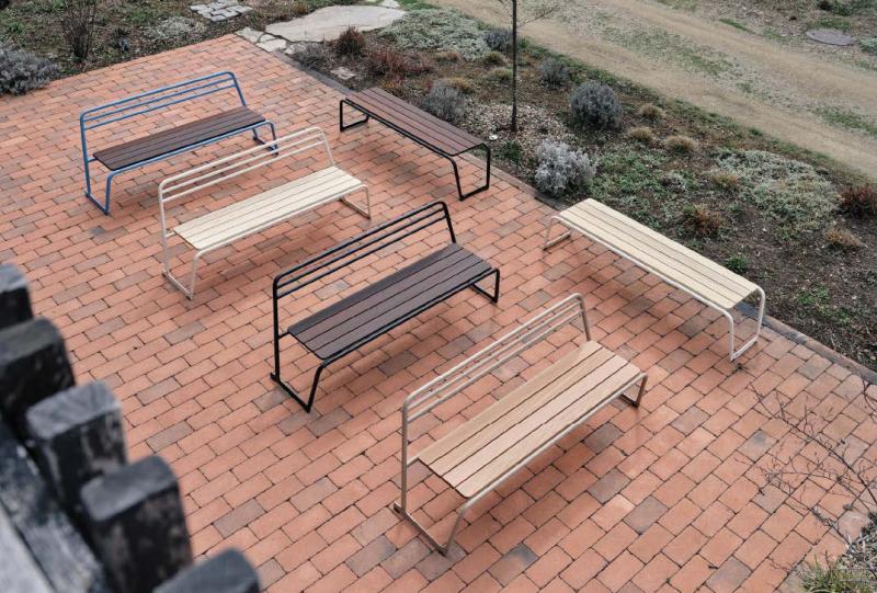 Sedalna površina iz lesenih letev. Hrbtni naslon in konstrukcija iz okroglih jeklenih profilov