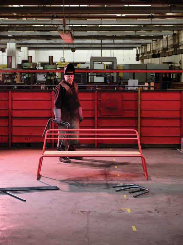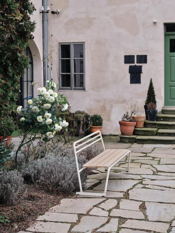 Sedalna površina iz lesenih letev. Hrbtni naslon in konstrukcija iz okroglih jeklenih profilov