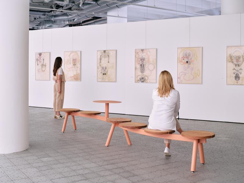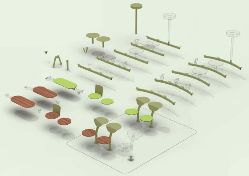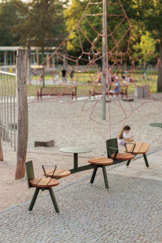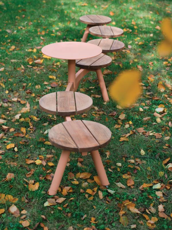 Klop s konstrukcijo iz jekene pločevine. Sedalna površina iz tropskega letev ali HPL.