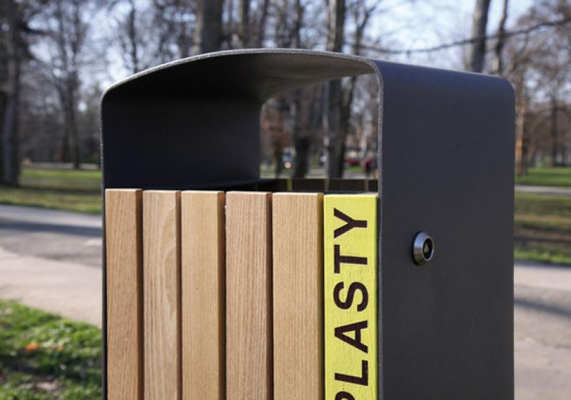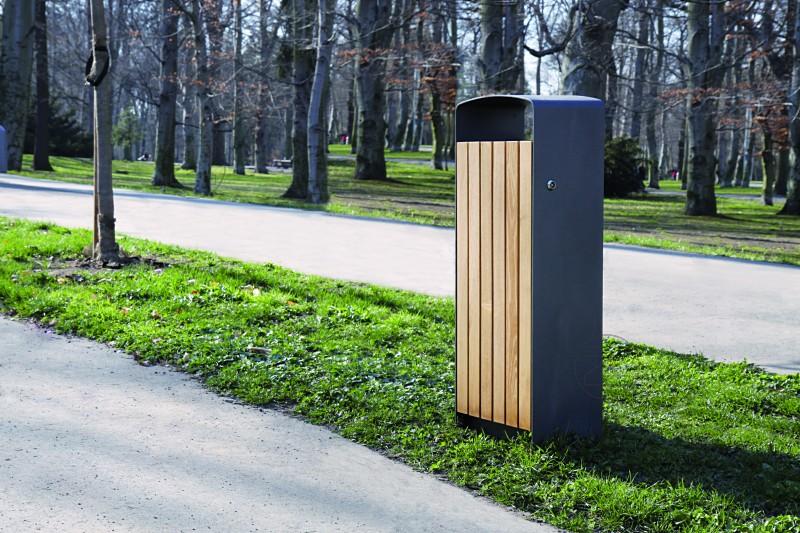 Konstrukcija koša v jekleni pločevini, z lesenimi letvami.