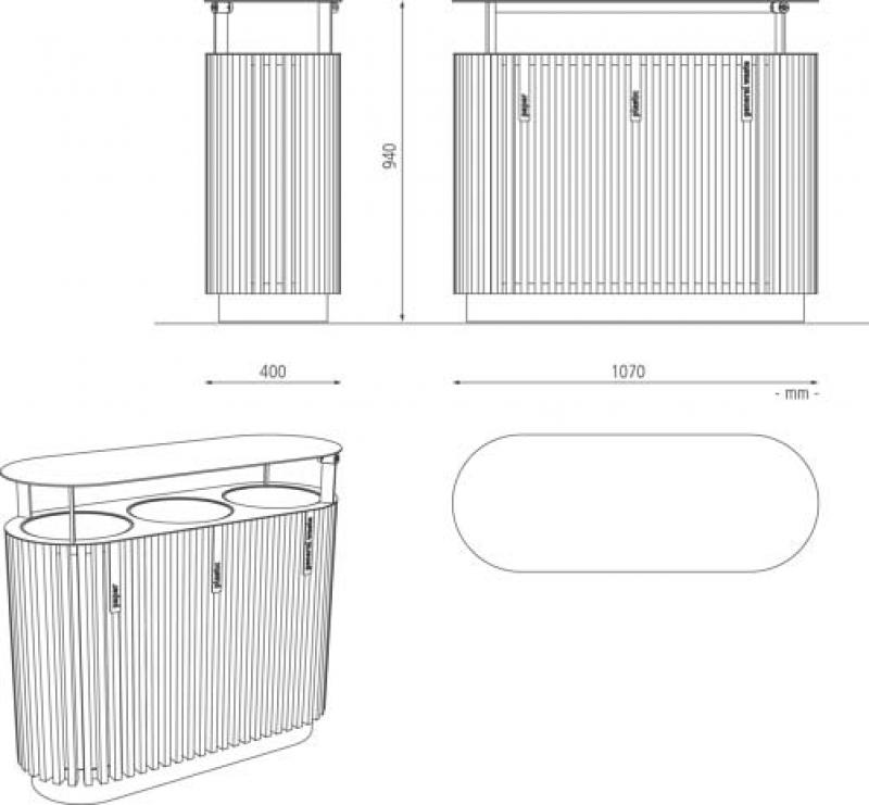 Konstrukcija koša v jekleni pločevini in aluminiju, z lesenimi letvami.