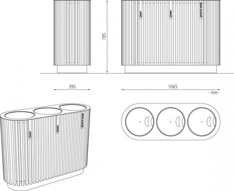 Konstrukcija koša v jekleni pločevini in aluminiju, z lesenimi letvami.