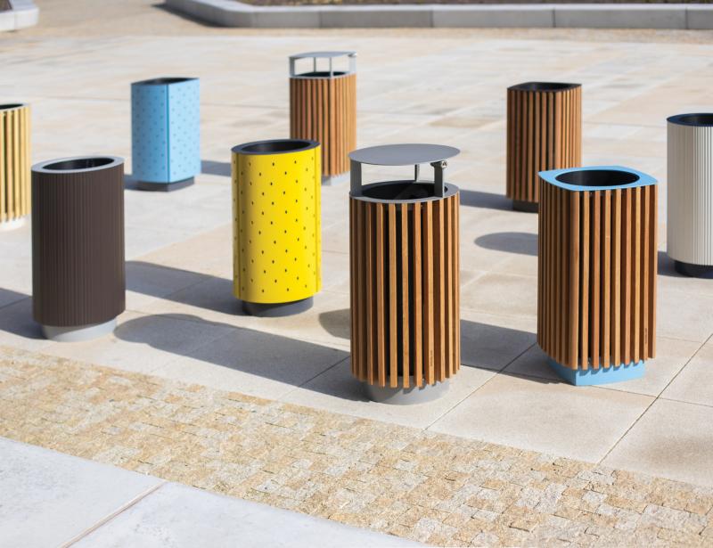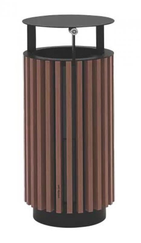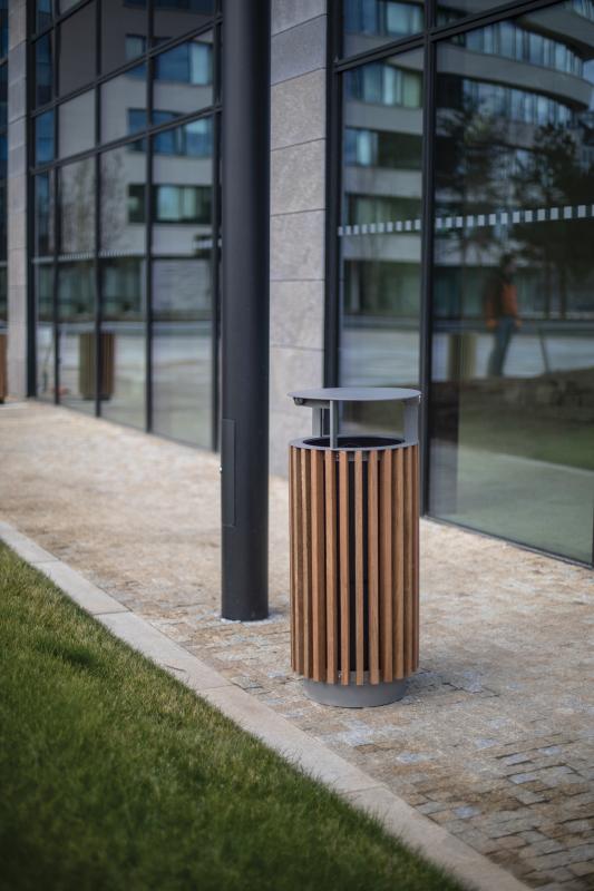 Konstrukcija koša v jekleni pločevini in aluminiju, z lesenimi letvami.