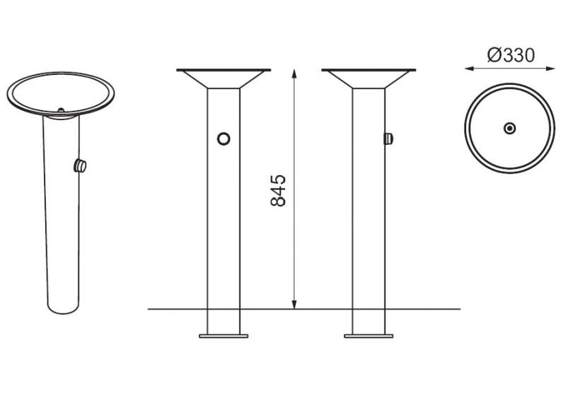 Konstrukcija: Iz nerjaveče pločevine. Površina / barva: Nerjaveče jeklo. Pritrjevanje: Za privijačenje. Napeljava: Pipa z reducirnim ventilom, odtok. Potreben je jašek z ventilom.