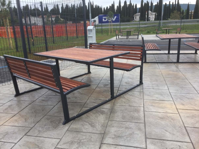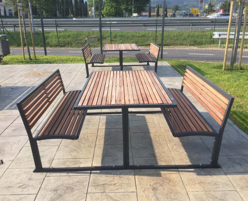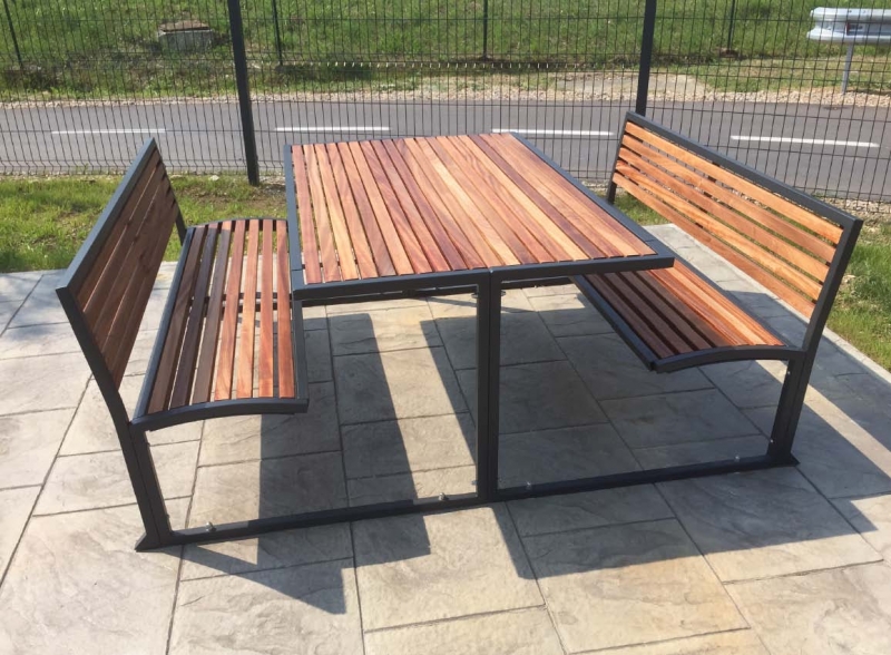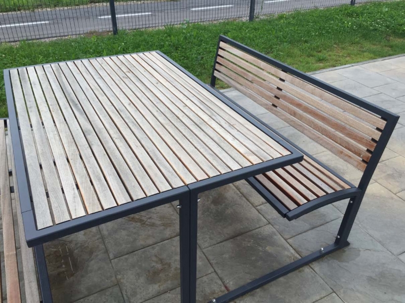Iz varjenih kvadratnih profilov 30 x 30 mm. Sedalo, naslonjalo in površina mize iz lesenih letev.