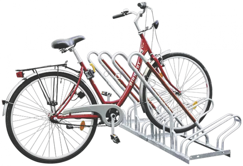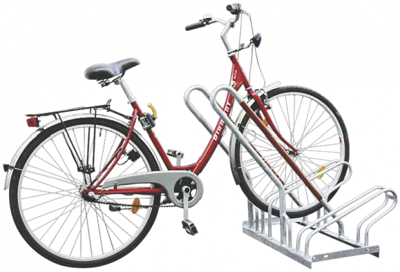 Stabilna vroče cinkana jeklena konstrukcija z privijačenimi držali za kolesa in naslonom za kolesa.
