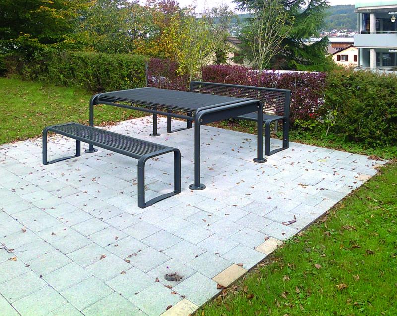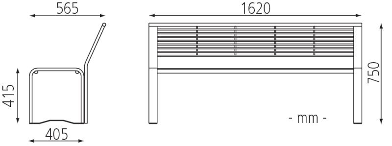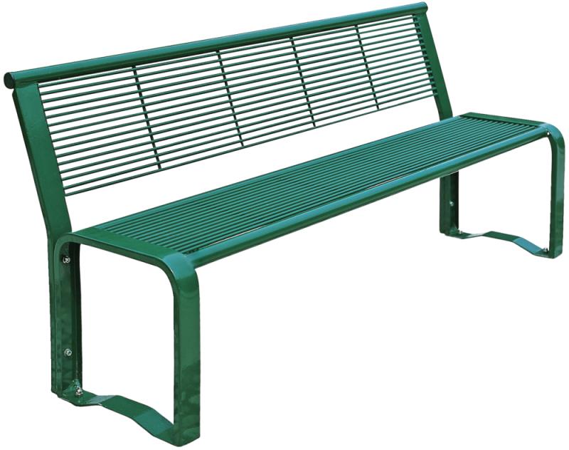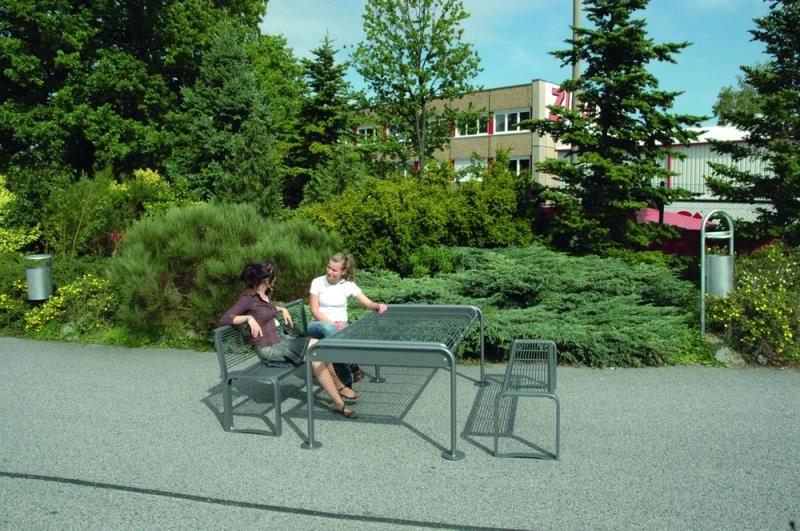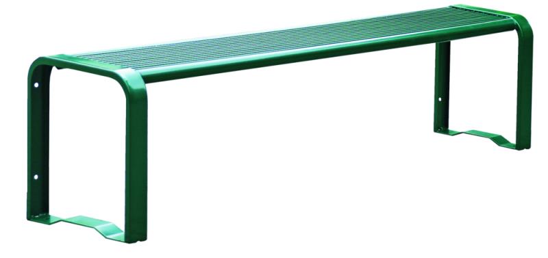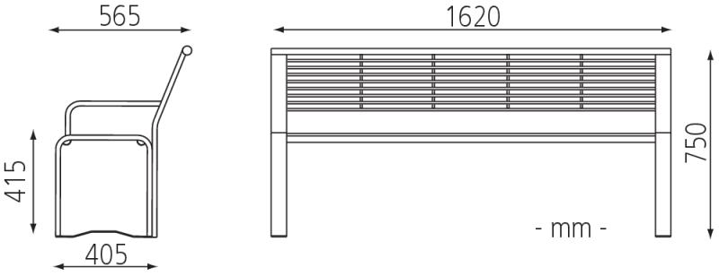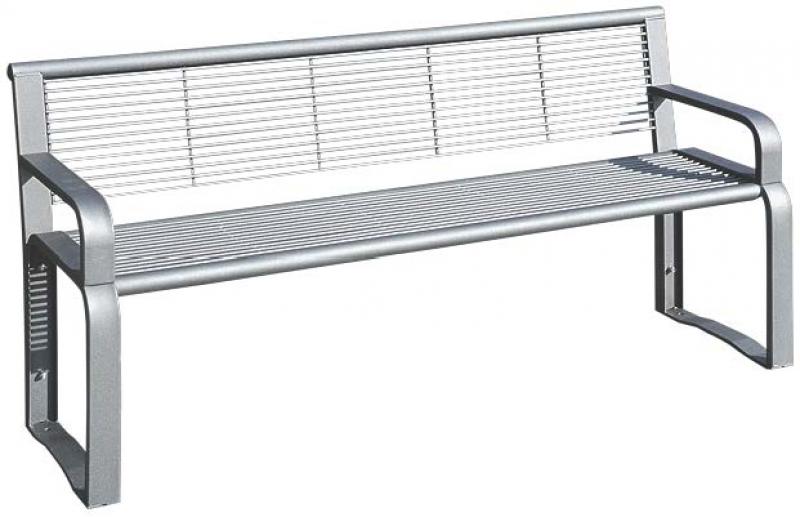 Klop v celoti iz jekla z naslonom za roke. Sedalna površina in naslon iz kovinskih palic 8 mm, okrogli profil.
