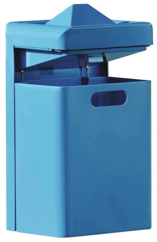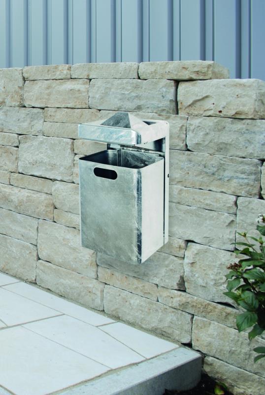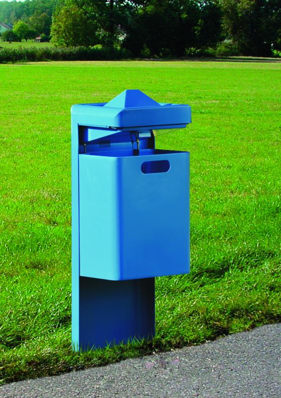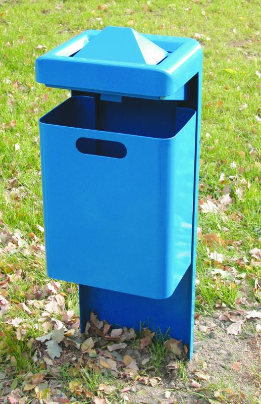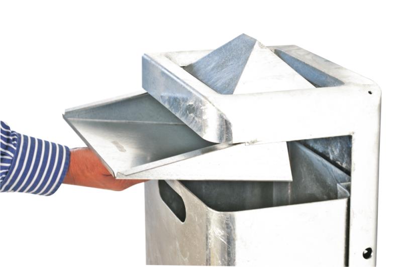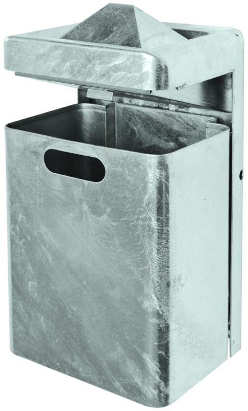 Koš za odpadke iz jeklene pločevine, s pepelnikom v obliki piramide. Na dnu posode se nahajajo luknje za odtekanje vode.