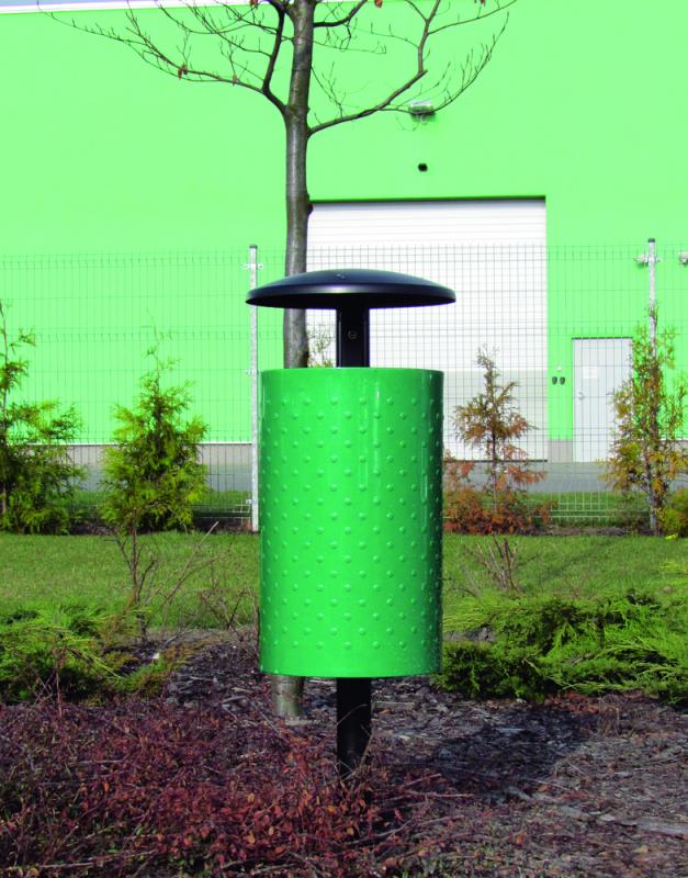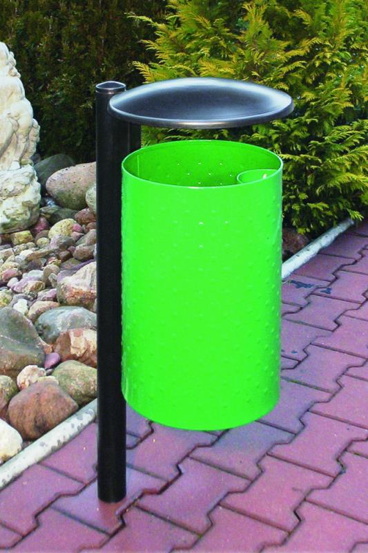 Perforirana izvedba v sivi barv. Vozličast v zeleni barvi. Steber in zaščitna streha v črni barvi.