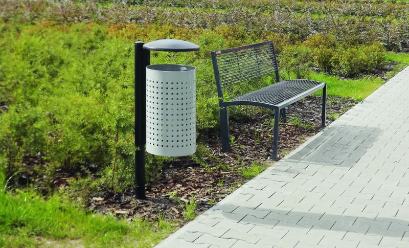 Perforirana izvedba v sivi barv. Steber in zaščitna streha v črni barvi.