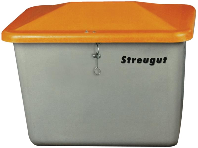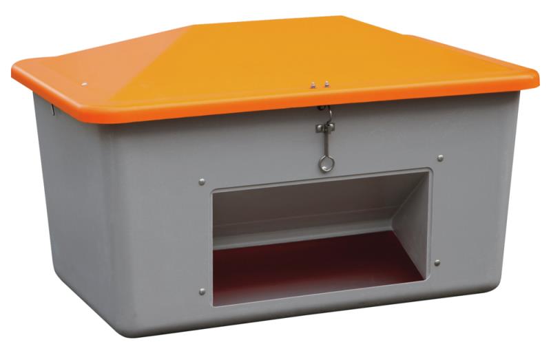 Kontejner in pokrov iz ojacane umetne mase (GFK) s steklenimi vlakni. Z opornim drogom na pokrovu v legiranem jeklu. Pokrov v oranžni barvi.