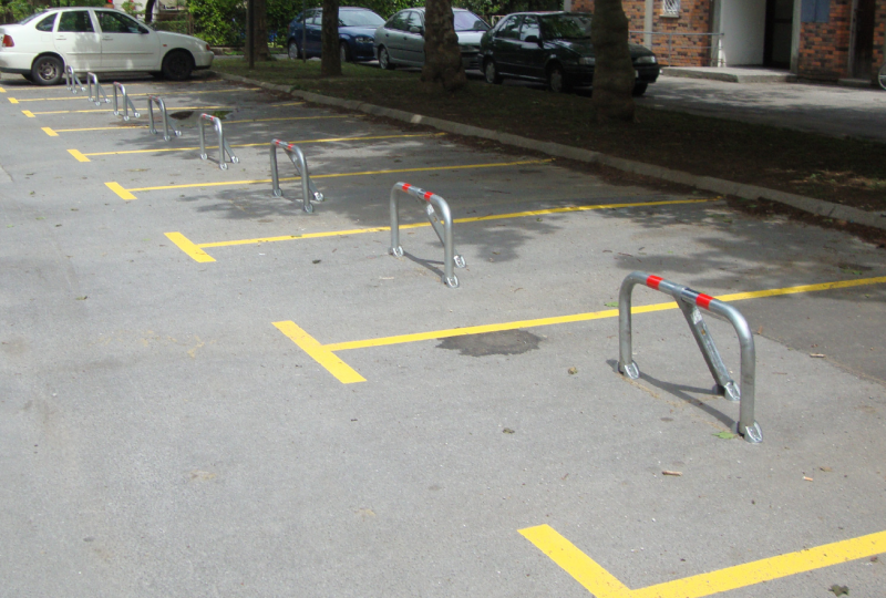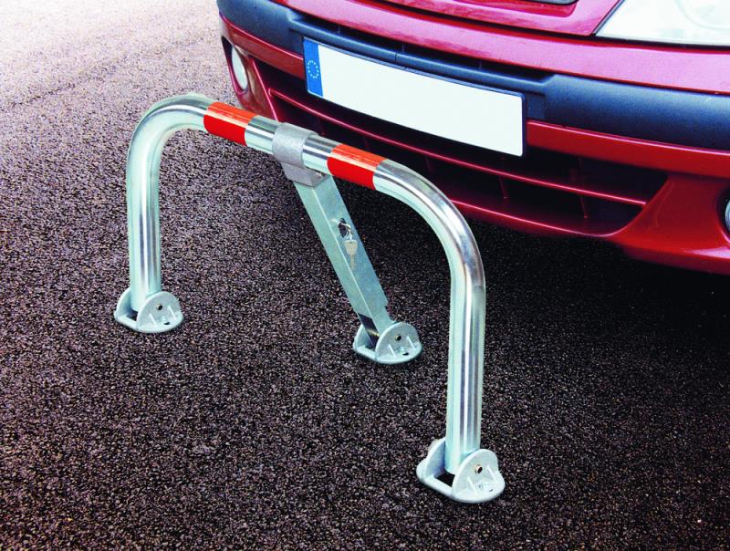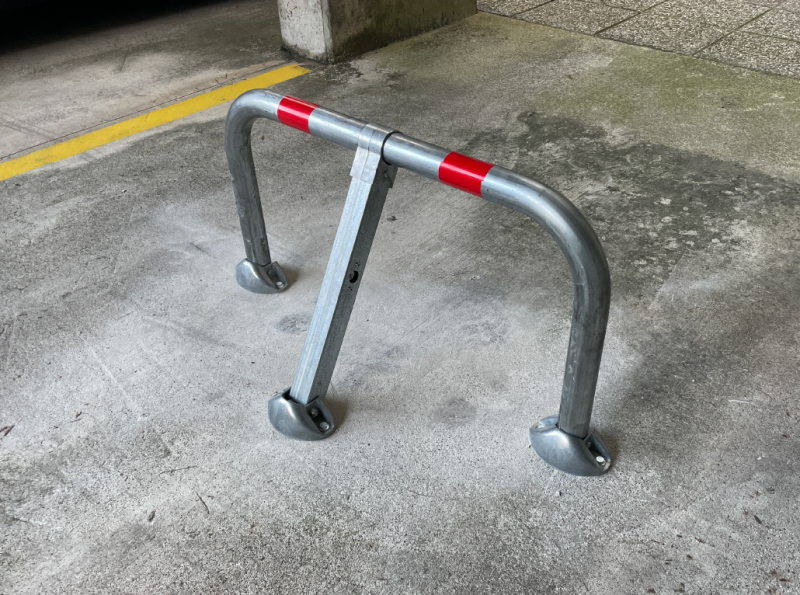 Parkirna zapora iz jeklenih cevi s teleskopskimi nogami. Tečaji iz vlitega aluminija.