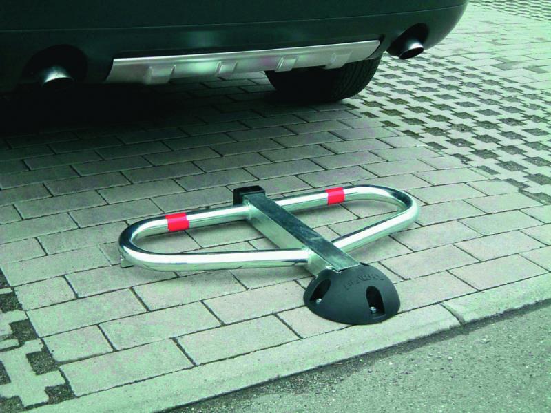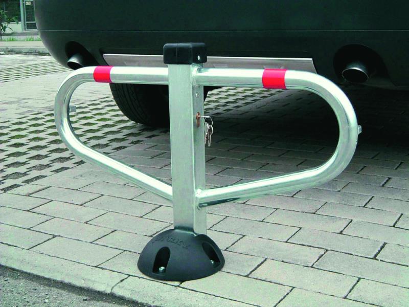 Parkirna zapora iz jekla, cevni profil premera 40 mm, zaščita iz umetne mase (poliamid), ki ščiti gume pri naletu.