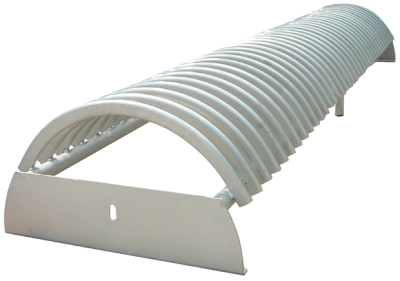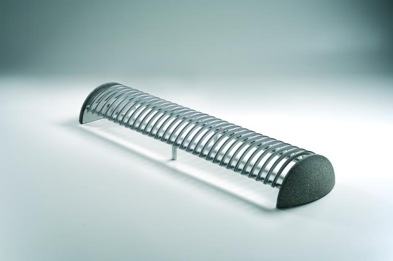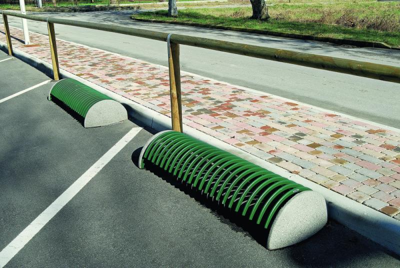Stojalo za kolesa z betonskim podstavkom, s stranskimi držali za pritrjevanje v tla s sidrnimi vijaki. Držalo je povezano z dvema ovalnima jeklenima profiloma. Parkirna površina je sestavljena iz polkrožnih zakrivljenih profilov. Primerno za eno ali dvostransko parkiranje koles.