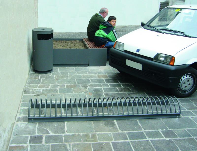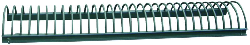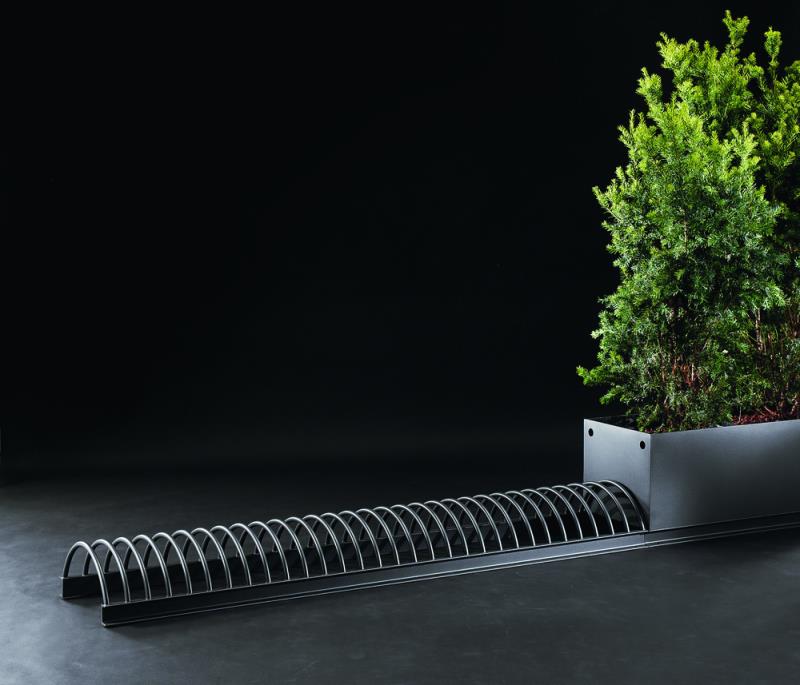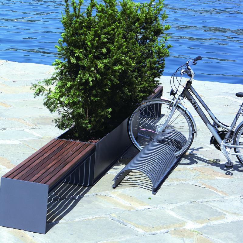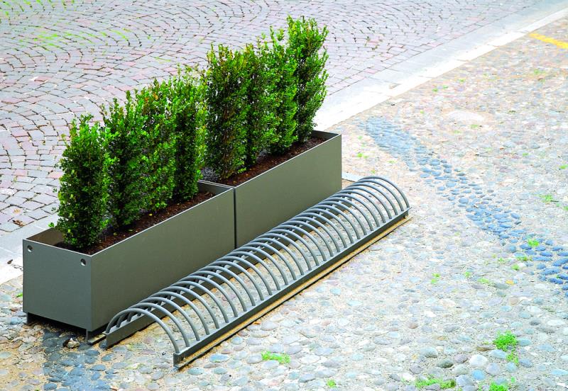 Stojalo za kolesa iz ploščatega jeklenega okvirja, s polkrožno upognjeno okroglo cevjo.
