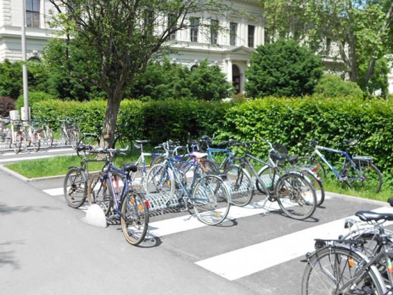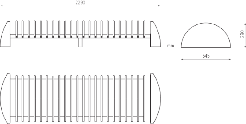 Stojalo za kolesa z betonskim podstavkom, s stranskimi držali za pritrjevanje v tla s sidrnimi vijaki. Držalo je povezano z dvema ovalnima jeklenima profiloma. Parkirna površina je sestavljena iz polkrožnih zakrivljenih profilov. Primerno za eno ali dvostransko parkiranje koles.