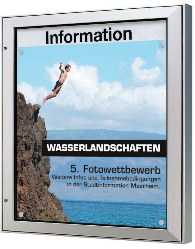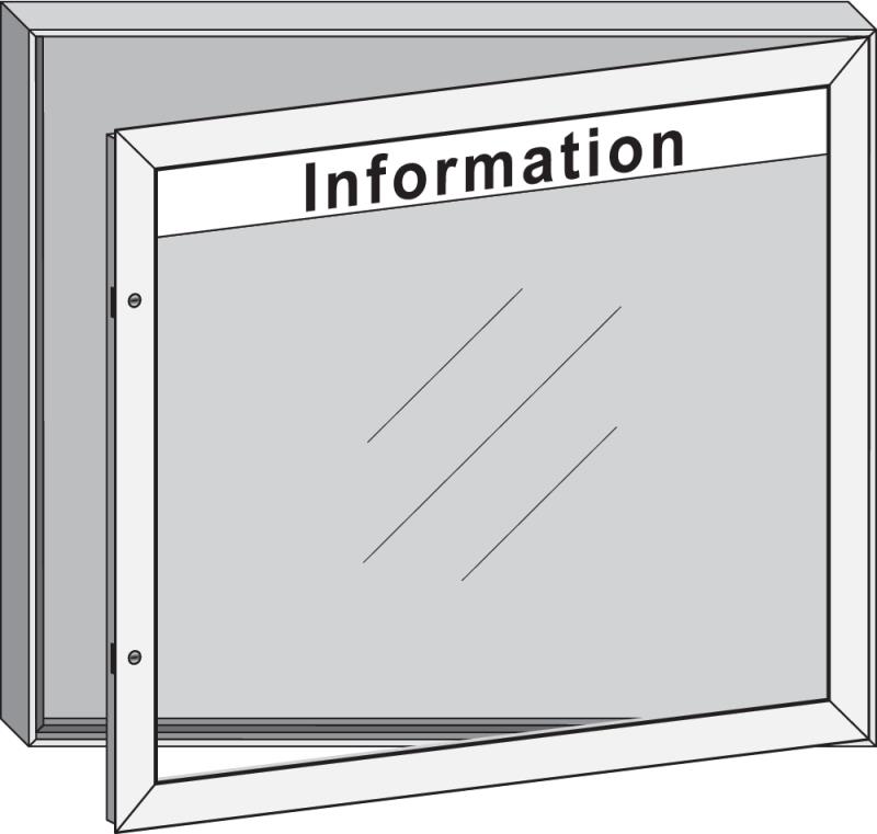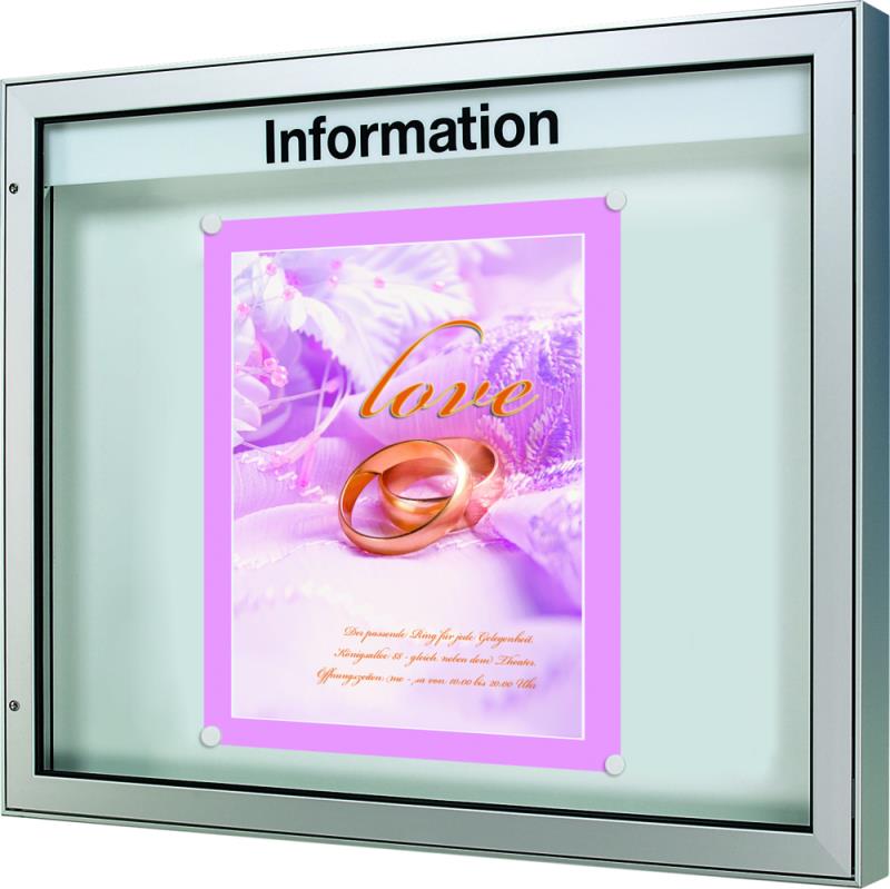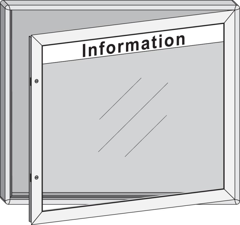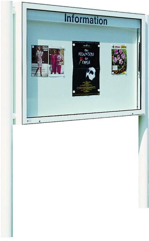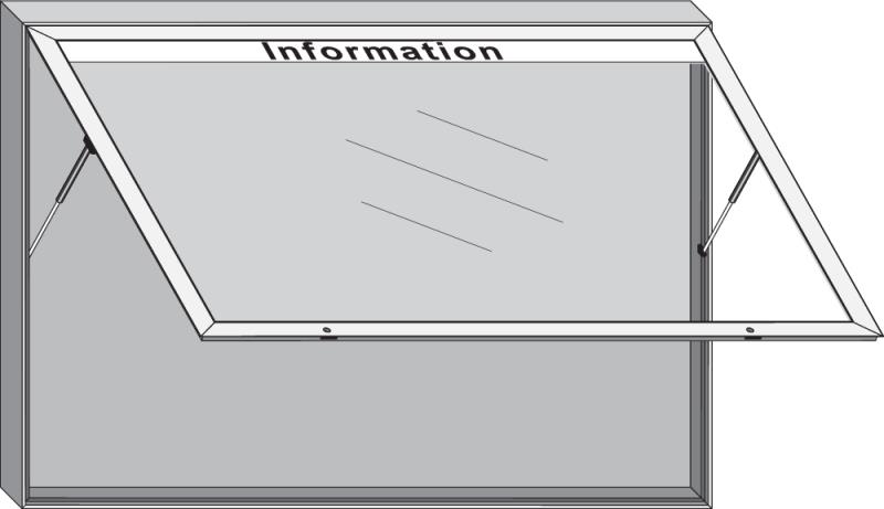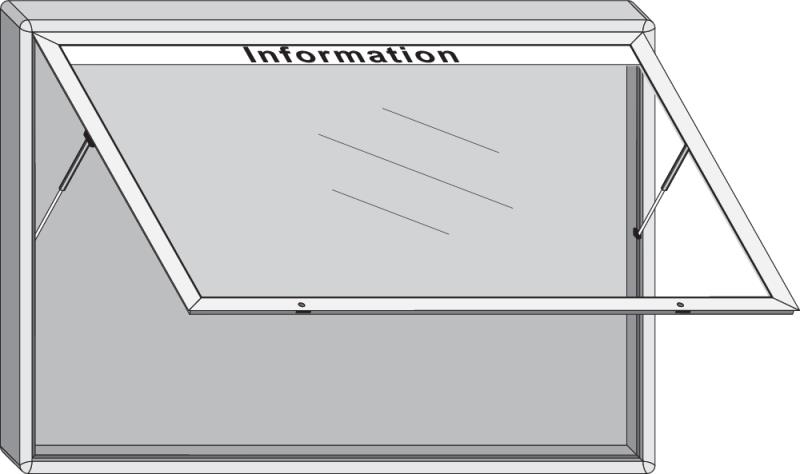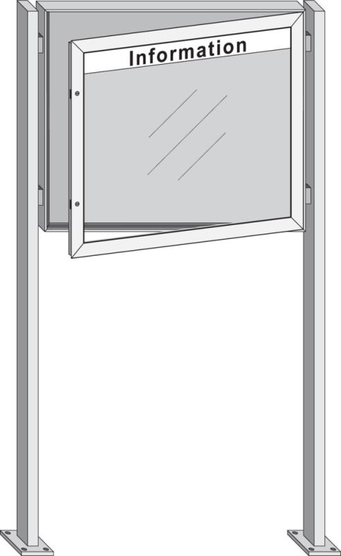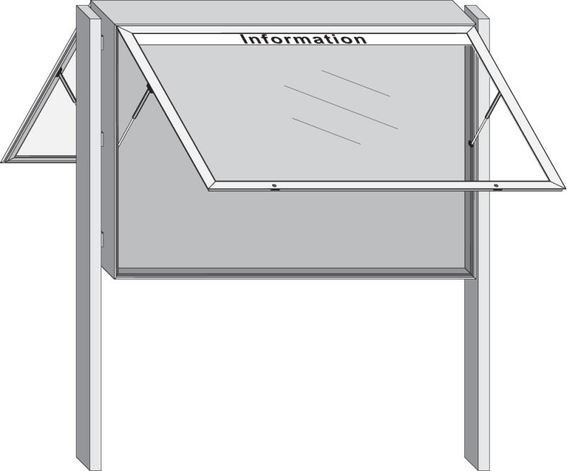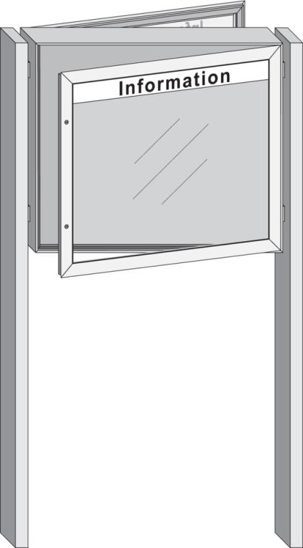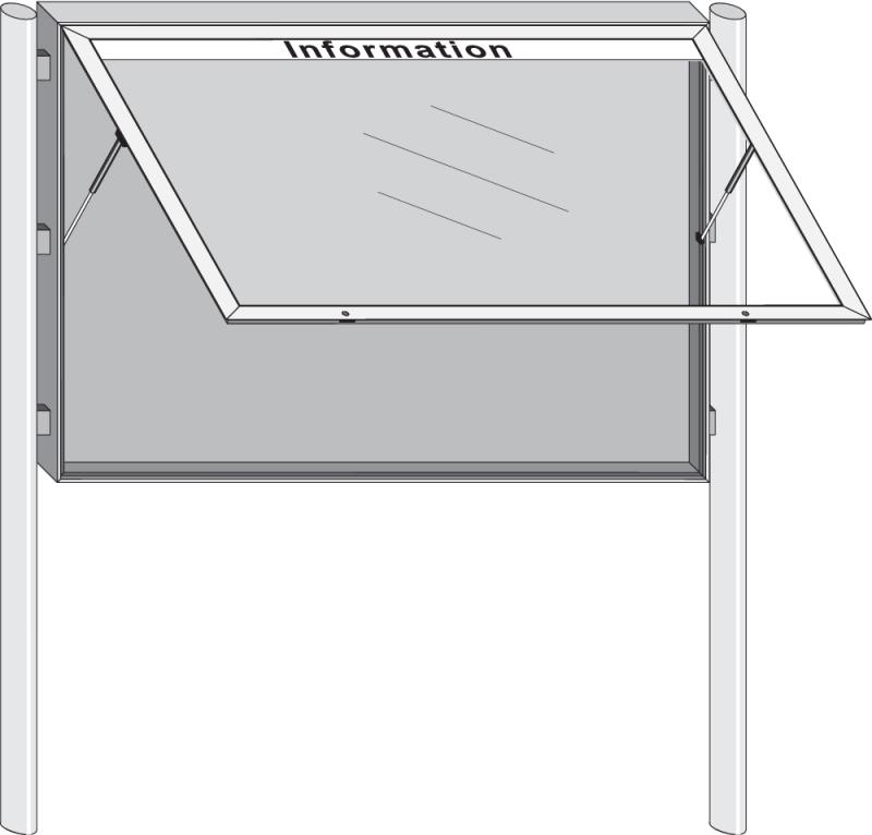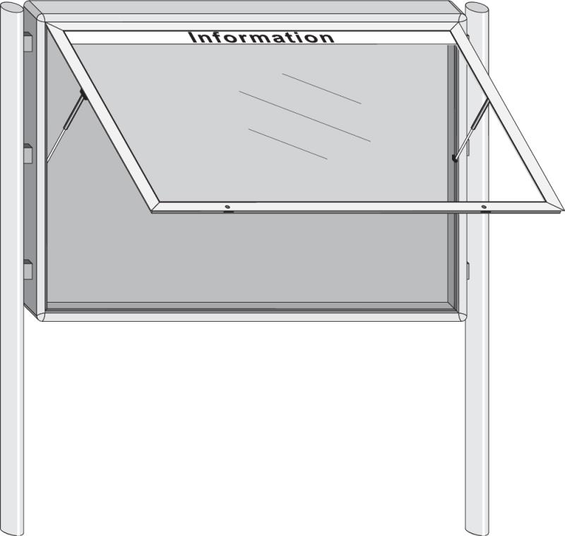 Konstrukcija:Enostranska aluminijasta vitrina, na izbiro z izdelani ostri ali zaobljenimi robovi. Manjši formati imajo izdelana krilna vrata z odpiranjem na desno, vecji formati se odpirajo vzdolžno s pomocjo plinske vzmeti. Hrbtna stena magnetna, v beli barvi. Dobava vsebuje napisno letev, brez napisa, centralni kljucavnici z 2 kljucema, prezracevalna odprtina preprecuje rosenje stekl. Možnost narocila okroglih stebrov premer 80 mm ali pravokotnih 100 x 40 mm, možna izvedba z razsveljavo.