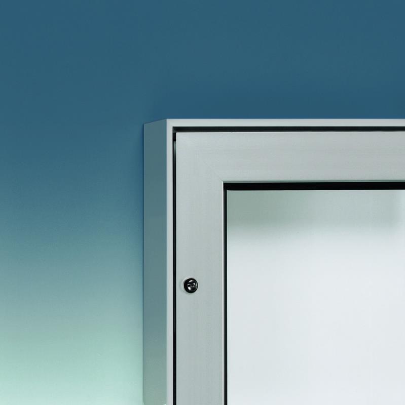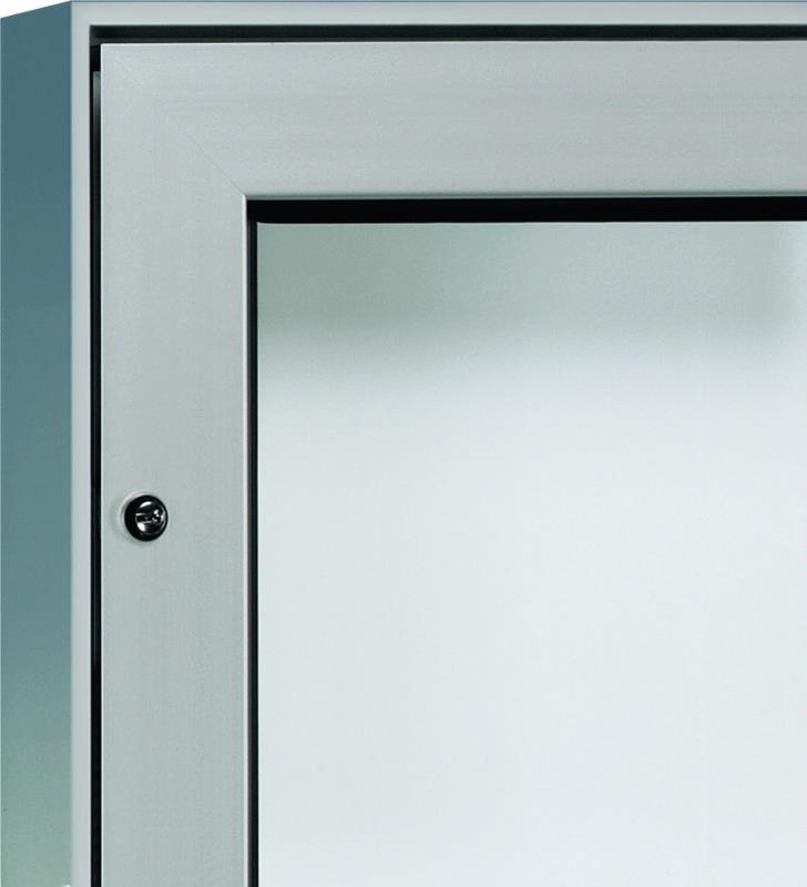 Srebrna eloksirana ali prašno barvana. Hrbtna stena eloksirana v beli barvi ali barvano v isti RAL barvi kot vitrina.