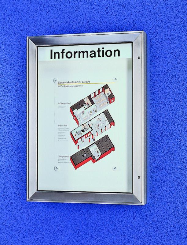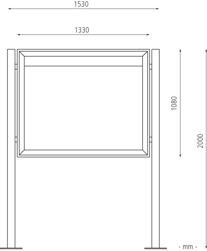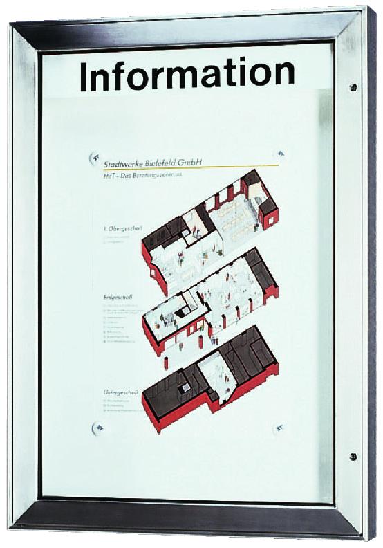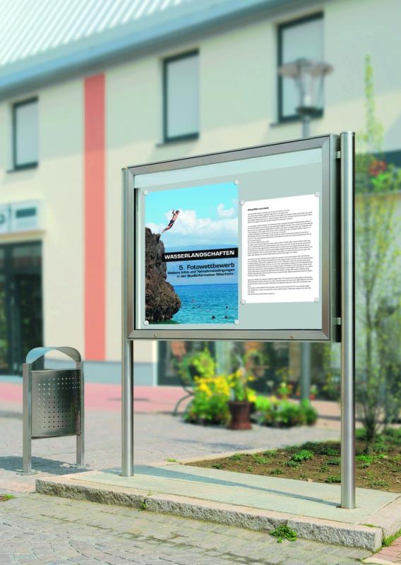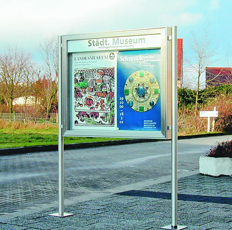Konstrukcija:Eno ali dvostranska vitrina prevlecena z legiranim jeklom, izdelani ostri robovi. Aluminijasta konstrukcija ojacana z legiranim jeklom. Manjši formati imajo izdelana krilna vrata z vzdolžnim odpiranjem, plinska vzmet. Vitrina ima odprtine ki omogocajo prezracevanje. Dobava vsebuje napisno letev, 2 centralni kljucavnici s kljucem. Hrbtna stena magnetna, v sivi barvi. Možnost narocila okroglih stebrov premer 76 mm ali pravokotnih 80 x 40 mm. Pri eno/dvodelni izvedbi z razsveljavo so stebricki 100 x 40 mm (glej dodatki).