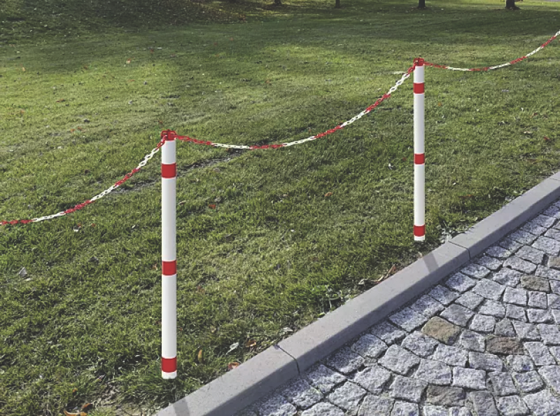 Konstrukcija / površina: Iz kvalitetnega umetnega materiala, v beli barvi z rdečo odsevno folijo. Glava za pritrditev verige. Pritrjevanje: Vijačenje na betonski temelj ali primeren tlak.